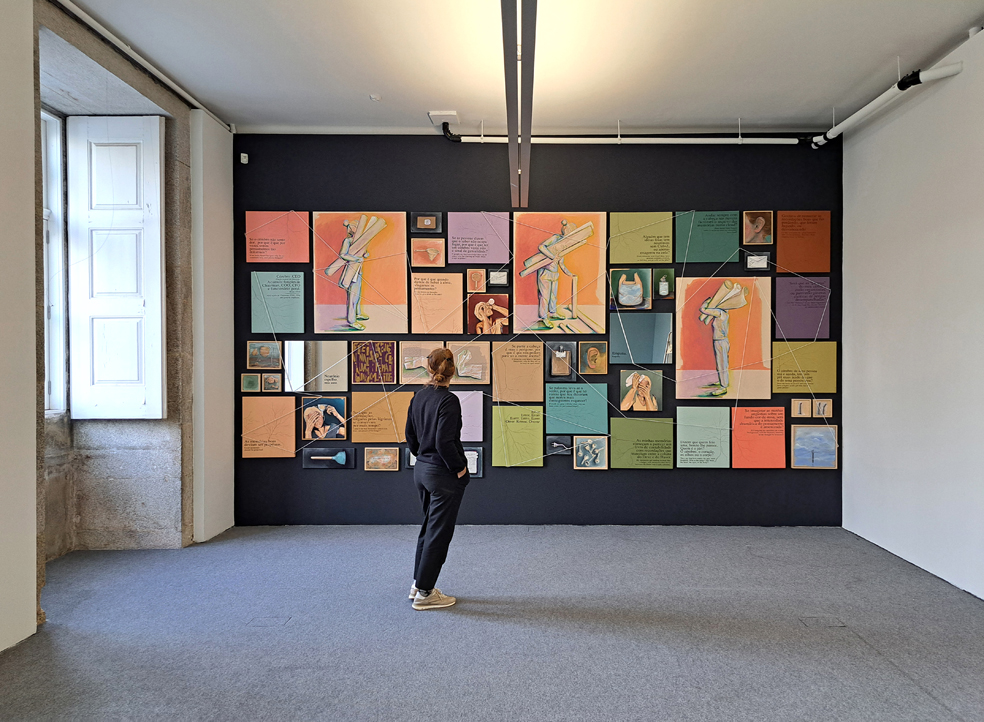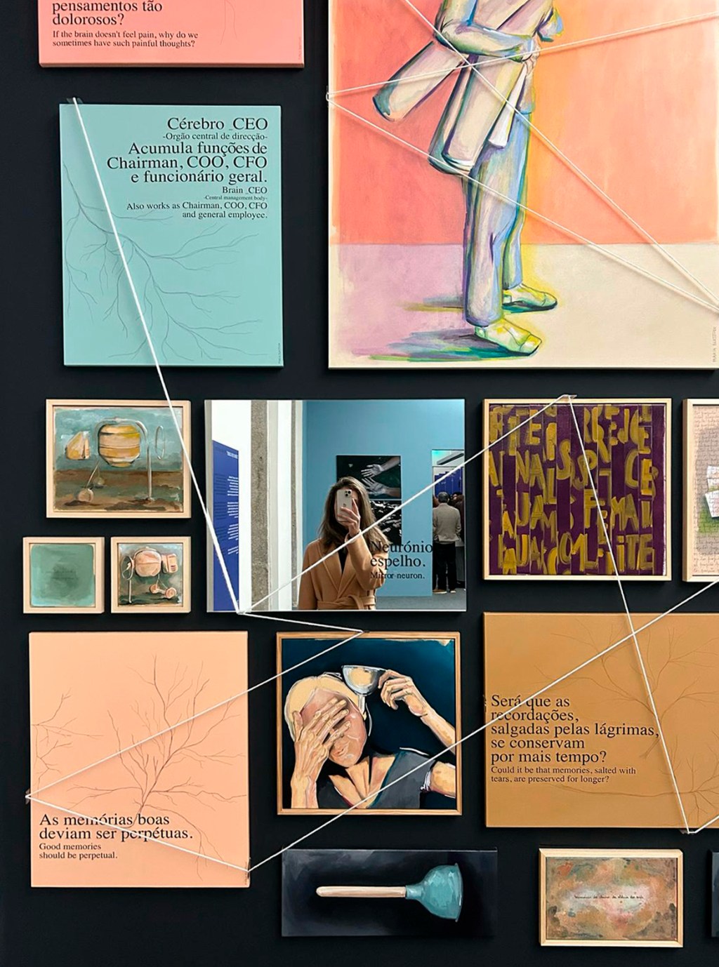 Sob a forma de um painel com um conjunto de diferentes pinturas e enunciados que remetem para vários estados de espírito, explorados ora com seriedade, ora com leveza, desdobra-se uma composição dinâmica, criativa e diversificada. Há, porém, um fio condutor e unificador, uma segunda linha que a artista introduz nesta exposição e que se afigura como que suspensa, percorrendo e trespassando toda a obra.