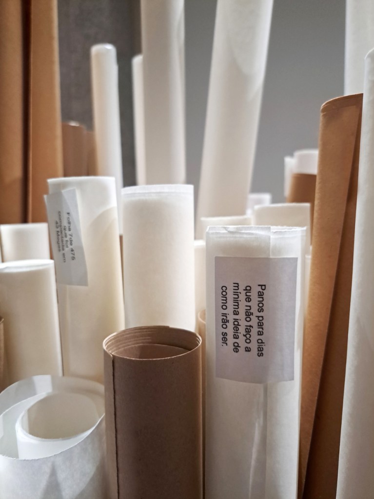Entendendo que a vida é constituída por recordações e projeções, a artista desenvolveu a obra “Linha de Vida” que, apesar de deter uma constituição reta, agrega uma série de curvas e emaranhados de inúmeros rolos de papel.