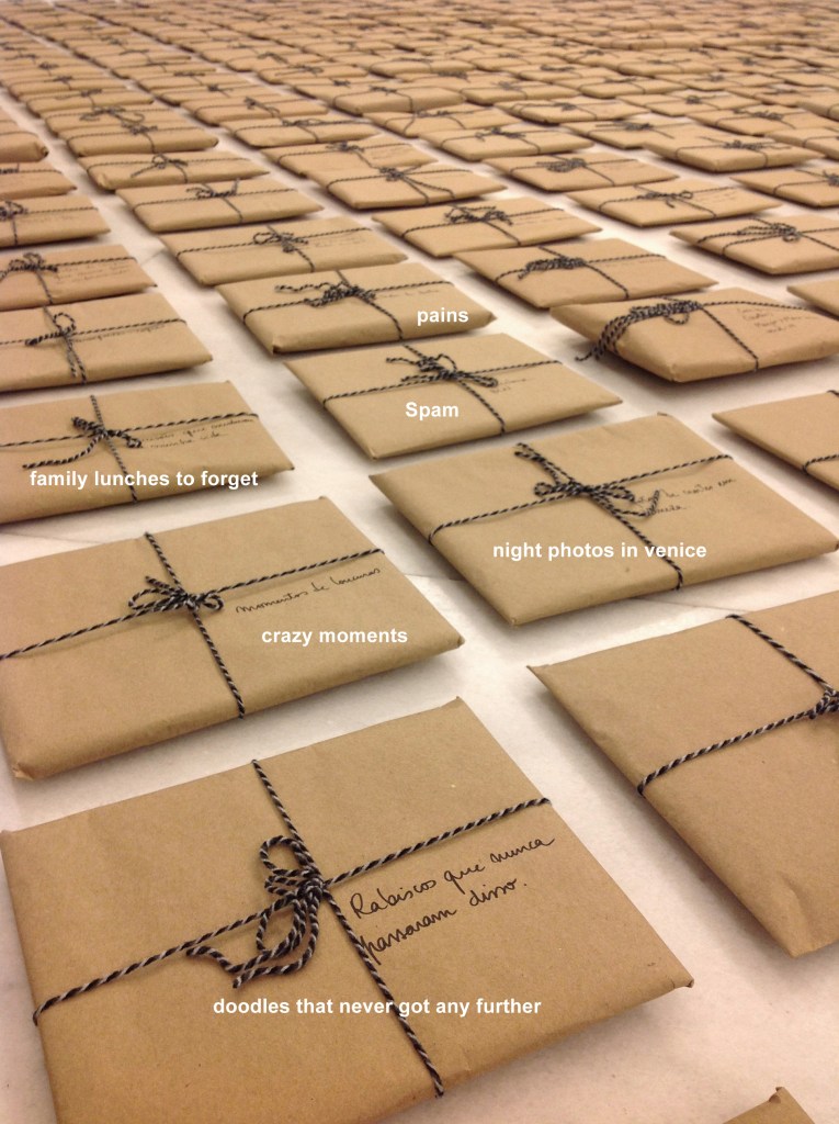 Alguns embrulhos apresentam recordações embaladas e atadas como presentes, outros memórias aprisionadas e mantidas fechadas para não serem relembradas.