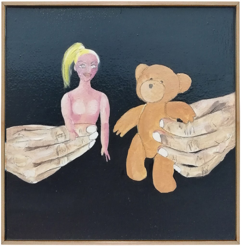 Flying dolls, deconstructed, or just inseparable partners of Teddy Bears are part of this series of works where painting is carried away by the memory of the most childish youth.