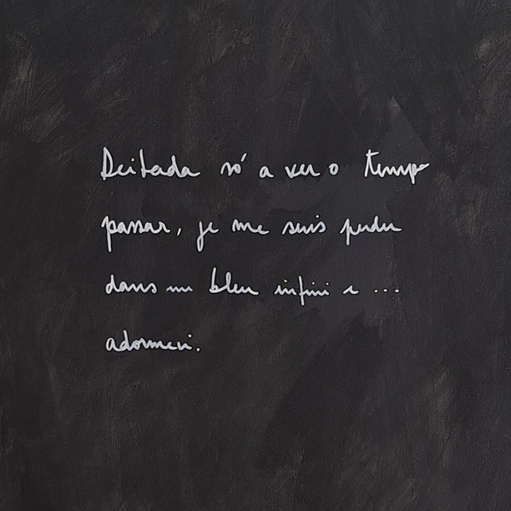 Estes momentos azuis de “pausa” são quebrados pela imagem forte do que poderão ser folhas, e por entre elas pode-se ler: “deitada, só a ver o tempo passar, je me suis perdu dans un bleu infini”. No frame seguinte, como um semicerrar de olhos apenas o traço preto contrastante se mantém no campo de visão e na memória e como numa tarde de calor as pálpebras acabam por ceder… “e adormeci”.