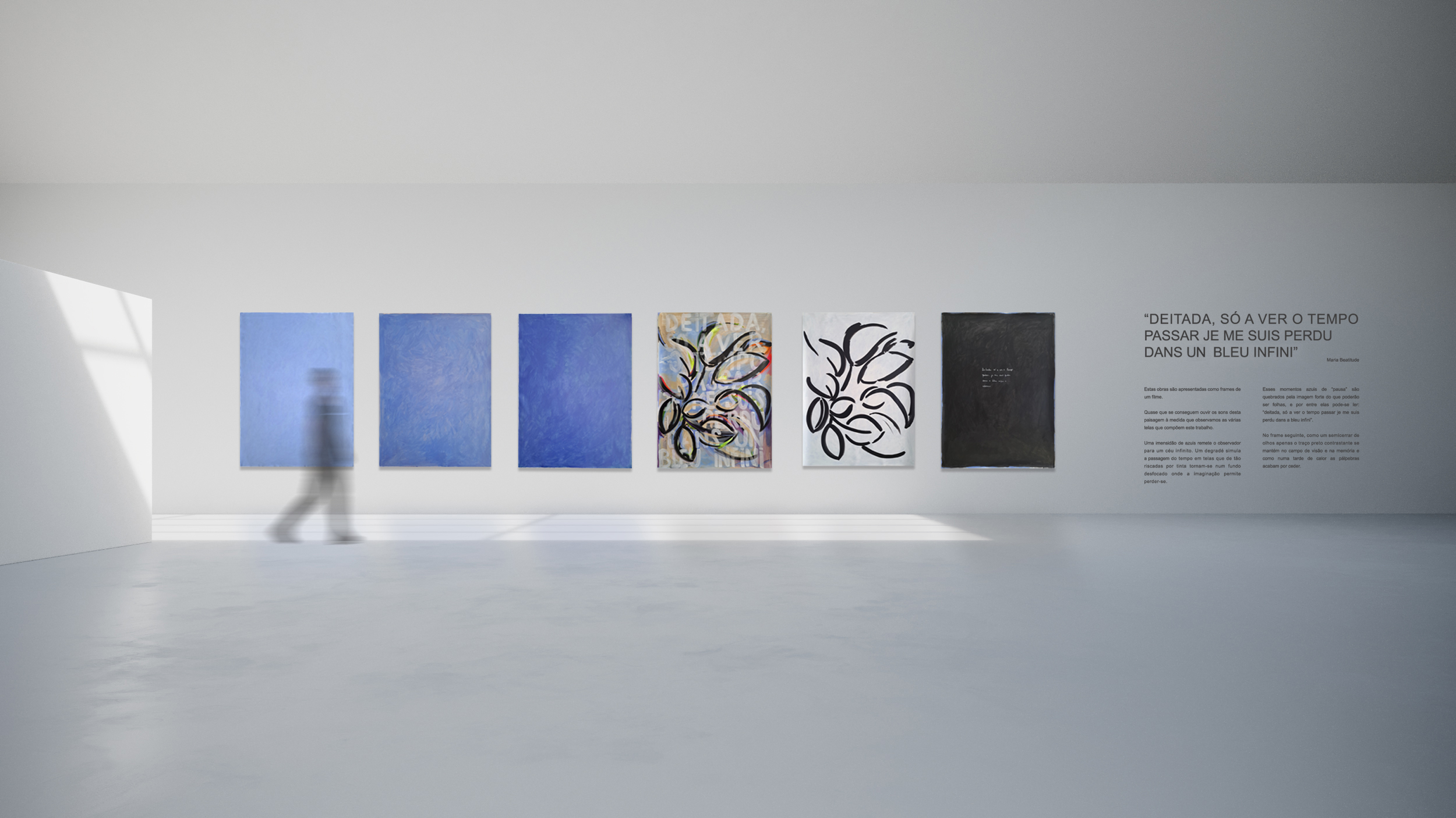 Uma imensidão de azuis remete o observador para um céu infinito. Um degradé que simula a passagem do tempo nas telas, que de tão riscadas por tinta tornam-se num fundo desfocado onde a imaginação permite perder-se.