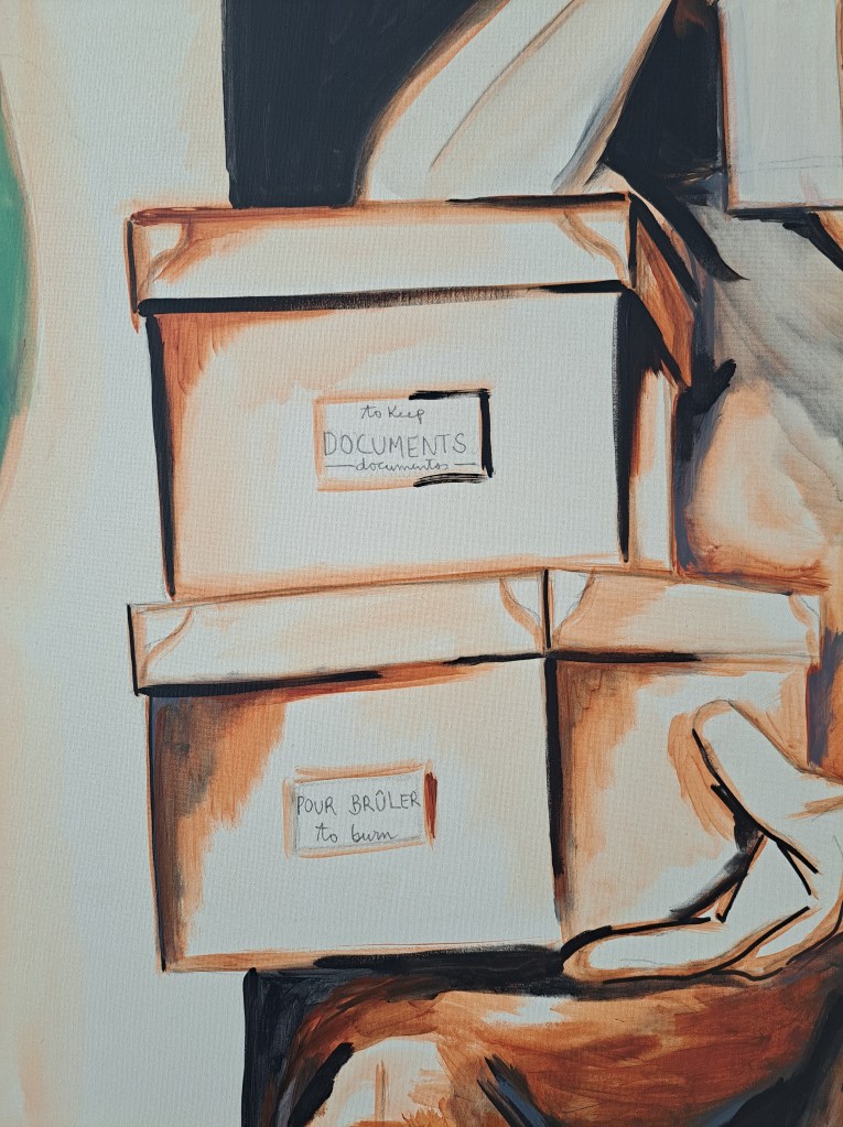 A work that presents boxes with documents to keep, things to burn, labeled hearts, or secrets to keep.