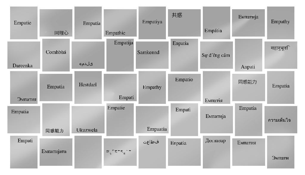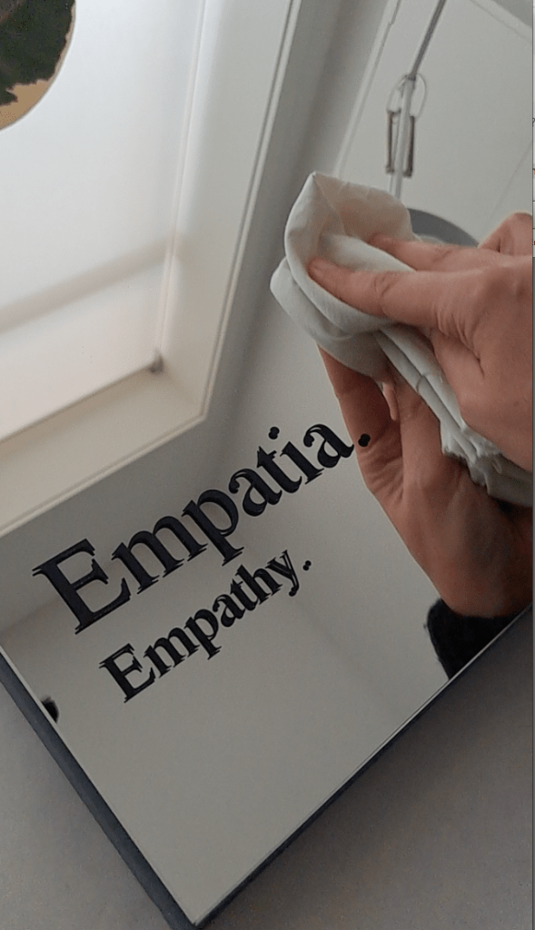 A ideia seria forrar uma parede ou espaço apenas com espelhos, que se encaixassem uns nos outros simulando união e tolerância, cada um com a palavra empatia escrita nas 50, 100 , 150 línguas mais faladas no mundo. (O tamanho da obra final dependeria do espaço disponível).