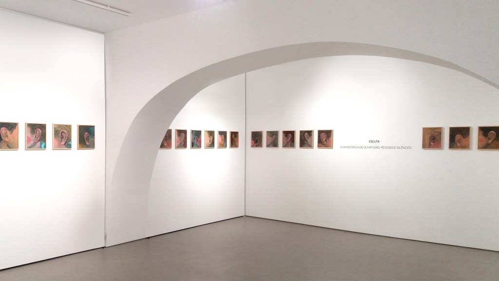 Uma sala que nos rodeia com obras da série “Escuta” impõe uma reflexão sobre o tema.