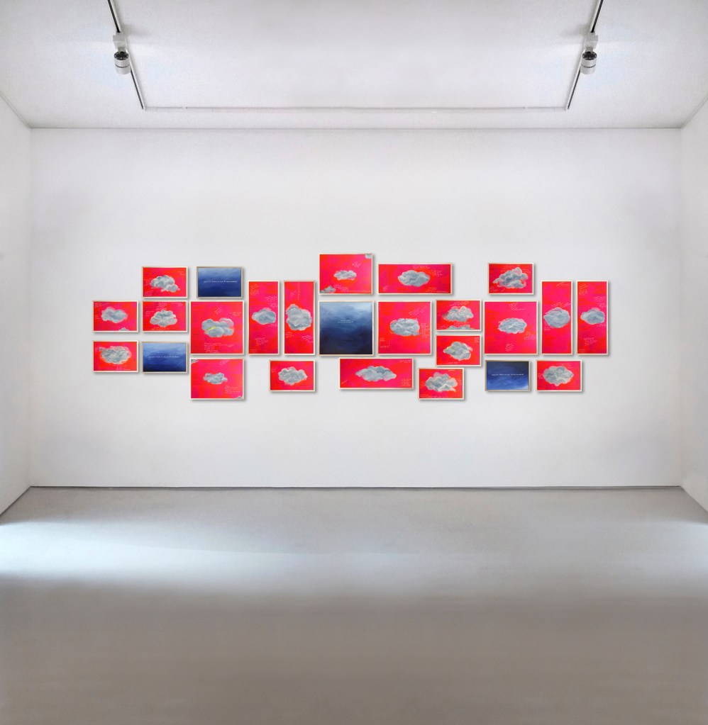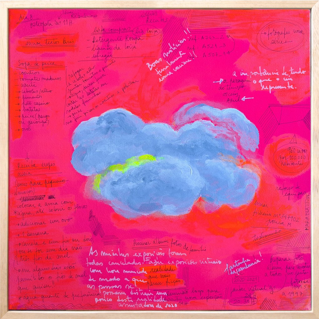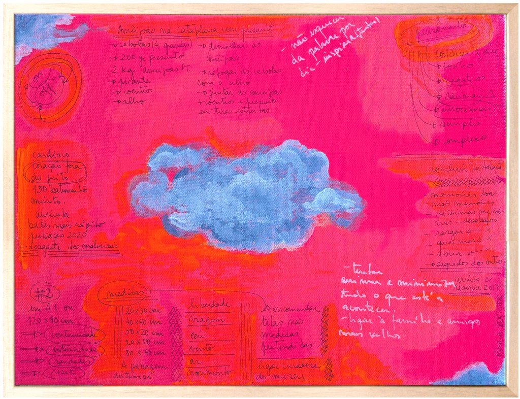 Listas de compras do supermercado, traços aleatórios, cores de tinta, referências, passwords, receitas, etc, são algumas das coisas que compõem este trabalho, bem como os dias vividos a olhar para o céu à espera de um milagre.